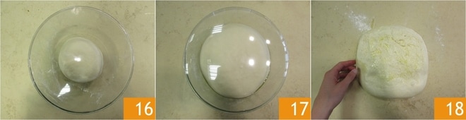 Geben Sie den geformten Teig in eine geölte Schüssel, bedecken Sie ihn mit Folie 16 und lassen Sie ihn bis zur Verdopplung des Teigs gehen, das dauert etwa 2 Stunden bei Raumtemperatur 17. Nach der Gehzeit wird der Teig schön aufgebläht sein, also übertragen Sie ihn auf die leicht bemehlte Arbeitsfläche 18