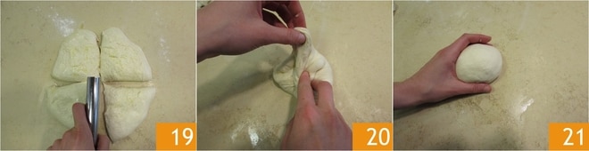 und teilen Sie ihn in 4 Portionen von etwa 200 g jeweils 19. Wie zuvor bringen Sie die Teigendstücke zur Mitte 20 und formen jede Kugel 21.