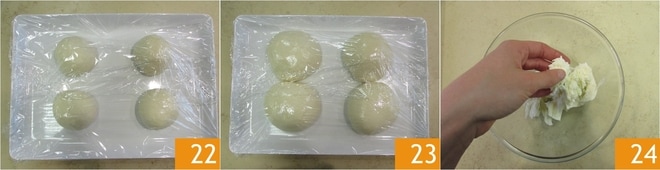 Übertragen Sie sie nach und nach auf ein geöltes Tablett, dann bedecken Sie sie mit Folie 22 und lassen sie 30 Minuten gehen 23. In der Zwischenzeit stellen Sie den Schamottstein im oberen Bereich des Ofens und heizen ihn auf 250°C im Umluftmodus vor. Zerkleinern Sie den Mozzarella mit den Händen 24 und bewahren Sie ihn im Kühlschrank auf.