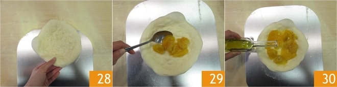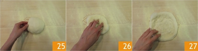 Wenn die Kugeln bereit sind, nehmen Sie die erste, übertragen Sie sie auf eine bemehlte Fläche 25 und drücken Sie sie vom Zentrum aus mit den Fingerspitzen 26. Dehnen Sie sie vorsichtig aus, sodass der äußere Teil dicker bleibt 27, damit sich während des Backens der Rand bildet.