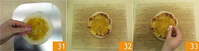 und Salz. Backen Sie die Pizza und lassen Sie sie etwa zehn Minuten backen. Nehmen Sie die Pizza mit der Schaufel aus dem Ofen und legen Sie sie auf ein Schneidebrett 32, belegen Sie sie mit dem zerkleinerten Mozzarella 33,