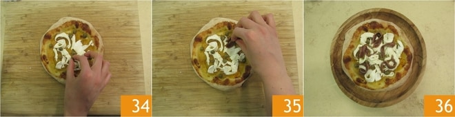 den Kapern 34 und den Sardellen, die vom Öl abgetropft wurden 35. Verfahren Sie so mit den anderen Pizzen und genießen Sie sie 36.