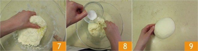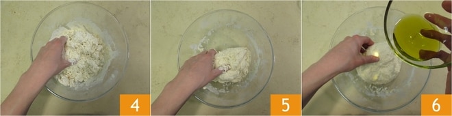 während Sie mit den Händen kneten 4. Wenn Sie das gesamte Wasser hinzugefügt haben und der Teig beginnt, Form anzunehmen 5, geben Sie das Öl in einem dünnen Strahl hinzu 6,