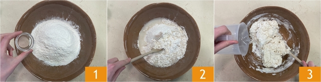 Um die Pizza mit einem mit Pesto und Ricotta gefüllten Rand zuzubereiten, geben Sie in eine Schüssel das Mehl und die Trockenhefe 1. Gießen Sie das Wasser nach und nach bei Zimmertemperatur unter Rühren mit einem Löffel hinzu 2, bis das Mehl die gesamte Flüssigkeit aufgesogen hat 3.