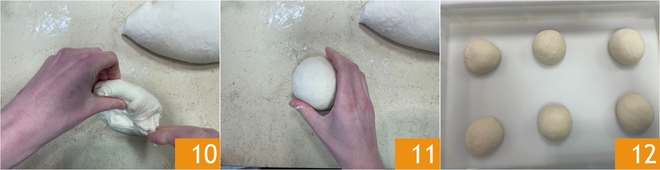 Formen Sie Teigbällchen: Rollen Sie den Teigling leicht aus 10, falten Sie den Teig zur Mitte hin 11 und formen Sie ihn zu einer Kugel. Legen Sie die Teigbällchen auf ein mit Backpapier ausgelegtes Tablett 12 und lassen Sie sie etwa eine Stunde bei Raumtemperatur gehen, bedeckt mit Frischhaltefolie. Dann stellen Sie das Tablett über Nacht (ca. 8-10 Stunden) in den Kühlschrank.