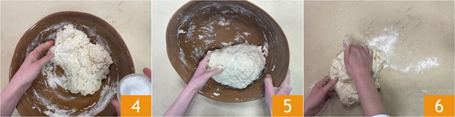 Formen Sie einen Teigballen, bedecken Sie ihn mit der Schüssel 7 und lassen Sie ihn mindestens 5 Minuten auf der Arbeitsfläche ruhen 8. Schneiden Sie nach dieser Zeit mit dem Teigschaber 6 Teiglinge von etwa 280 g ab 9.