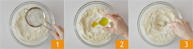 Um die Pizza mit Natron vorzubereiten, siebt das Mehl und das Natron in eine große Schüssel 1, dann fügt das Öl hinzu 2 und beginnt zu mischen 3.