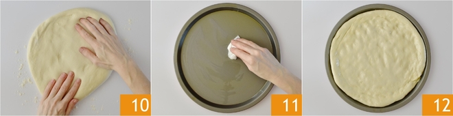 Nach der Ruhezeit nehmt den Teig zurück und dehnt ihn vorsichtig mit den Händen aus, bis ein Kreis mit einem Durchmesser von etwa 26 cm entsteht 10. Ölt ein Blech derselben Größe 11 und legt den Teig darauf 12.