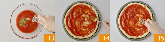 Mischt nun in einer Schüssel 300 g Tomatenpassata mit Salz, Öl und Oregano 13. Verteilt die Tomatensauce auf der Pizza 14 und würzt sie mit einem weiteren Schuss Öl 15. Backt den Boden im vorgeheizten statischen Ofen bei 190° für 10 Minuten.