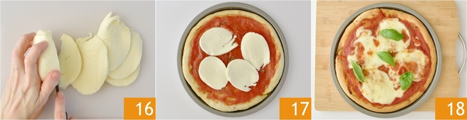 In der Zwischenzeit schneidet den Fiordilatte-Mozzarella in Scheiben 16. Nehmt den Boden aus dem Ofen und fügt den Mozzarella hinzu 17, dann backt ihr erneut für 10-15 Minuten oder bis der Käse geschmolzen ist. Nach dem Backen mit frischem Basilikum garnieren und sofort eure Pizza mit Natron servieren 18!
