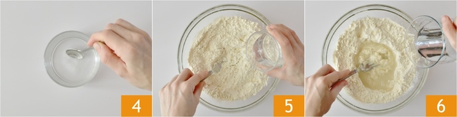 Löst das Salz in wenig Wasser, das aus der Gesamtdosis entnommen wurde, auf 4, dann gießt die Mischung in die Schüssel 5 und mischt weiter, indem ihr nach und nach den Rest des Wassers hinzufügt 6.