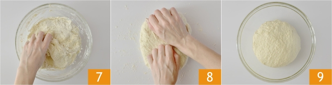 Knetet die Mischung mit den Händen, bis das Mehl das gesamte Wasser aufgenommen hat 7, dann wechselt auf die leicht bemehlte Arbeitsfläche und arbeitet den Teig 10-12 Minuten weiter 8; ihr müsst einen glatten und homogenen Teig erhalten. Gebt den Teig in eine geölte Schüssel 9, deckt ihn mit einem Tuch ab und lasst ihn eine Stunde bei Zimmertemperatur ruhen.