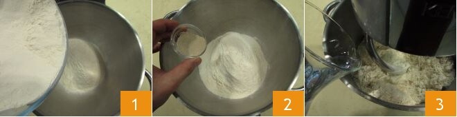 Um den Pizzateig zuzubereiten, beginnen Sie mit dem Einfüllen des Mehls in die Schüssel der Küchenmaschine 1. Fügen Sie die Hefe 2 und 100 Gramm Wasser hinzu, dann schalten Sie die Küchenmaschine mit montiertem Haken bei mittlerer Geschwindigkeit ein 3.