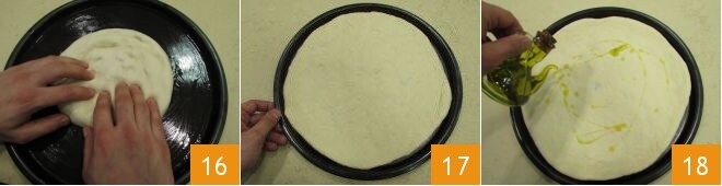 und beginnen Sie von der Mitte nach außen zu drücken, ziehen Sie die Ränder bei Bedarf leicht 16. Wenn der Teig zu elastisch ist und dazu neigt, in seine ursprüngliche Form zurückzukehren, lassen Sie die Pizza, die Sie gerade ausrollen, ruhen und fahren Sie mit einer anderen fort, damit die vorherige ruhen kann. Versuchen Sie, den Teig über die gesamte Oberfläche des Blechs zu verteilen 17. Geben Sie einen Schuss Öl auf die Pizza und beginnen Sie mit der Zubereitung 18.