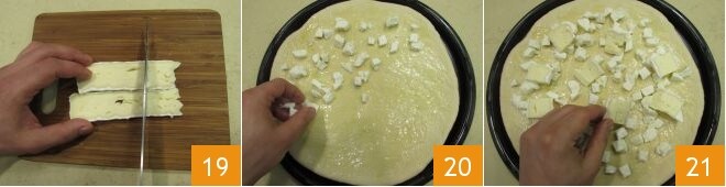 Schneiden Sie den Brie in Scheiben, die etwas mehr als 5 mm dick sind, und schneiden Sie dann Quadrate von etwa 2,5 cm Seitenlänge 19. Legen Sie nun den grob gehackten Mozzarella auf die Pizza 20 und fügen Sie den Brie hinzu 21.