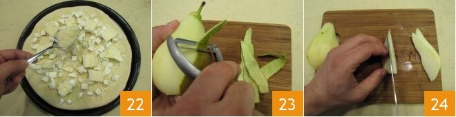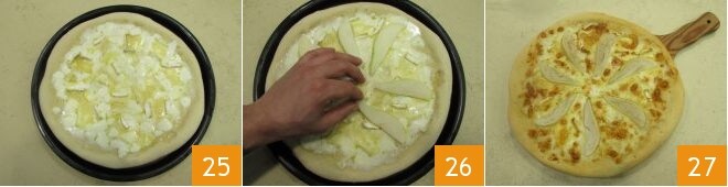 Nach 10 Minuten nehmen Sie die Pizza aus dem Ofen 25 und legen die Birnen strahlenförmig auf die Pizza 26 und backen Sie sie für weitere 10/15 Minuten bei 200 °C. Sobald Sie die Pizza mit Birnen und Brie aus dem Ofen nehmen, servieren Sie sie sofort 27.