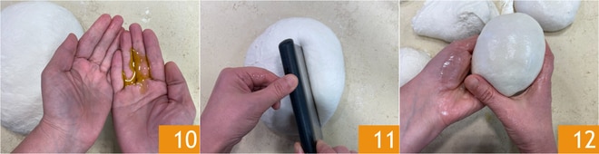 Die Hände mit etwas Öl einfetten 10 und den Teig in 6 Stücke von ca. 250 g schneiden 11, dann diese bearbeiten, indem Sie den Teig nach unten ziehen, dann zwischen Daumen und Zeigefinger zusammendrücken 12 und "abreißen", d.h. den überschüssigen Teig abschneiden, wie man es bei Mozzarella macht. Alternativ können Sie die Teiglinge rundwirken.