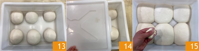 Die Teiglinge in eine Gärkiste legen 13, mit einem Deckel schließen 14 und 4 Stunden bei Raumtemperatur gehen lassen. Nach der Gehzeit die Oberfläche der Teiglinge mit Grieß bestäuben 15.