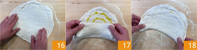 Einen Teigling auf eine mit Grieß bestäubte Arbeitsfläche legen, dann mit den Fingerspitzen über die gesamte Oberfläche dehnen 16. Mit einem Schuss Öl würzen und den Teig langsam falten 17, um einen Halbmond zu formen 18, dabei sicherstellen, dass die Innenseite gleichmäßig geölt ist. Im statischen Ofen bei 250°C etwa 5-6 Minuten backen, vorzugsweise auf einem zuvor erhitzten Backstein.