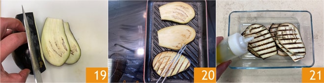 Für die Füllung: Die Auberginen in etwa 1 cm dicke Scheiben schneiden 19, dann 3-4 Minuten pro Seite grillen 20. Mit Öl 21, Basilikum, Salz und Pfeffer würzen.