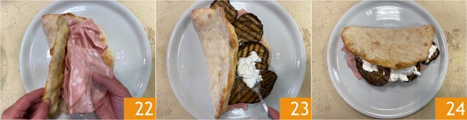 Die Pizza Tacos aus dem Ofen nehmen und vorsichtig öffnen. Das Innere mit Mortadella 22, gegrillten Auberginen und Stracciatella 23 füllen. Eure Pizza Tacos ist bereit zum Genießen 24!