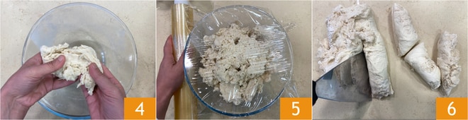 Den Teig mit den Händen zerkleinern 4 und in eine Schüssel legen. Mit Frischhaltefolie abdecken 5 und eine Stunde bei Raumtemperatur, dann 24 Stunden im Kühlschrank bei 4°C ruhen lassen. Nach dieser Zeit den Vorteig aus dem Kühlschrank nehmen und etwa eine Stunde bei Raumtemperatur ruhen lassen, dann in kleine Stücke teilen 6.