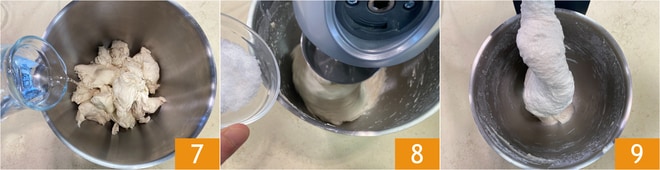 Den Vorteig in die Küchenmaschine geben und etwa drei Viertel des für den Teig vorgesehenen Wassers hinzufügen 7, dann bei niedrigster Geschwindigkeit starten. Sobald der Teig anfängt, sich zu verbinden, Salz hinzufügen 8 und den Rest des Wassers langsam einfließen lassen. Kneten, bis ein glatter und gut verbundener Teig entsteht 9.