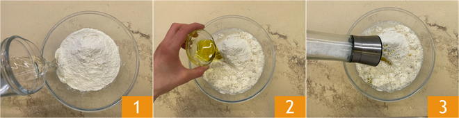 Um die Pizzette ohne Gärung mit Kürbis und Zola vorzubereiten, beginnen Sie mit dem Teig: Geben Sie das Mehl, das Wasser 1, das Öl 2 und das Salz 3 in eine Schüssel.