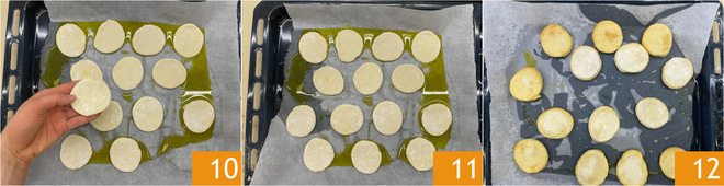 Legen Sie die Kreise auf ein mit Backpapier ausgelegtes Backblech, das Sie vorher mit etwas Öl bestrichen haben 10. Backen Sie sie in einem statischen Ofen bei 190° 11 für etwa 15 Minuten 12.