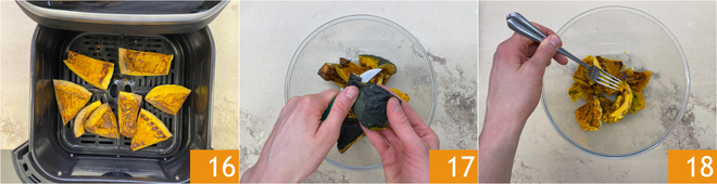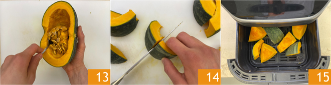 In der Zwischenzeit kümmern Sie sich um den Kürbis: Entfernen Sie die Samen und die inneren Fäden 13, dann schneiden Sie das Fruchtfleisch in große Stücke 14. Legen Sie den Kürbis in den Korb der Heißluftfritteuse 15 und backen Sie ihn bei 180° für 15 Minuten.