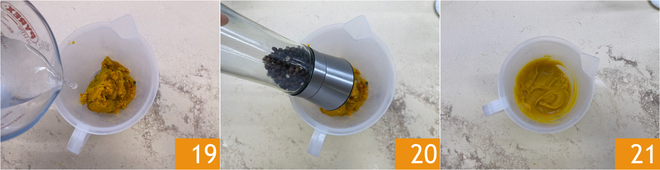 Geben Sie den zerdrückten Kürbis in den Mixbehälter, fügen Sie dann einen Schuss Wasser 19, Salz, Pfeffer und Öl hinzu 20. Mixen Sie, bis Sie ein glattes und homogenes Püree erhalten 21.