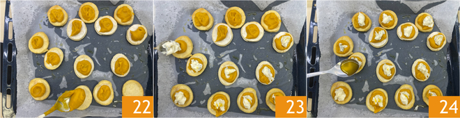 Entnehmen Sie die Pizzette aus dem Ofen und belegen Sie sie mit der Creme 22, dann backen Sie sie weitere 5 Minuten. Nach dieser Zeit vervollständigen Sie sie mit dem Gorgonzola 23 und etwas Honig 24.