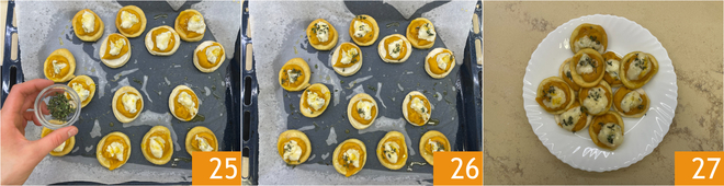Zum Schluss garnieren Sie mit den Thymianblättchen 25 und lassen Sie sie abkühlen 26. Ihre Pizzette ohne Gärung mit Kürbis und Zola sind bereit zum Genießen 27!
