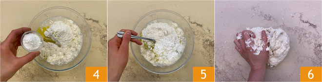 Fügen Sie auch die Instanthefe hinzu 4 und beginnen Sie zu kneten 5. Wenn die Masse Konsistenz annimmt, legen Sie sie auf die Arbeitsfläche und kneten Sie sie kurz mit den Händen 6.