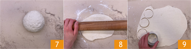 Wenn Sie eine glatte Kugel erhalten haben 6, rollen Sie sie auf der leicht bemehlten Arbeitsfläche mit einem Nudelholz aus 8, bis Sie einen Teig von etwa 3-4 mm Dicke haben. Dann schneiden Sie mit einem Ausstecher Kreise mit einem Durchmesser von 7 cm aus 9; mit dieser Menge erhalten Sie etwa 16 Stück.
