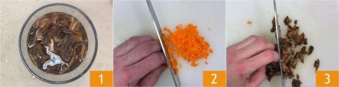 Um die Polenta-Gnocchi mit Rehragout zuzubereiten, beginnt ihr mit dem Ragout: Weicht die getrockneten Steinpilze etwa 20 Minuten in lauwarmem Wasser ein 1. In der Zwischenzeit Zwiebel, Sellerie und Karotte putzen und fein hacken 2. Hackt auch die halbe Knoblauchzehe. Sobald die Pilze eingeweicht sind, gut ausdrücken und klein schneiden 3. Das Pilzwasser abseihen und beiseite stellen; es wird für das Kochen des Ragouts benötigt.