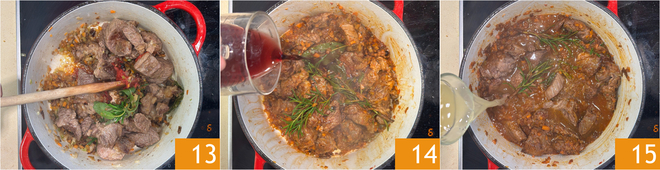 Alles gut umrühren 13, dann mit dem Rotwein ablöschen 14. Die Hitze erhöhen und den Alkohol vollständig verdampfen lassen, anschließend mit heißer Brühe zugießen 15.