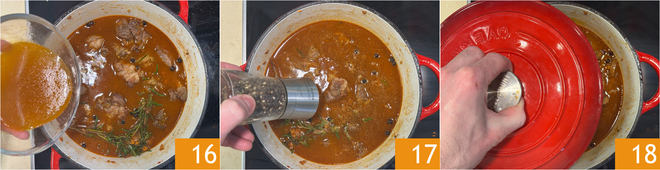 Gebt auch das abgesiebte Pilzwasser hinzu 16, dann mit Salz und Pfeffer abschmecken 17 und zum Kochen bringen. Dann Hitze reduzieren, mit Deckel abdecken 18 und bei niedriger Hitze mindestens 1,5–2 Stunden köcheln lassen, zwischendurch gelegentlich umrühren.