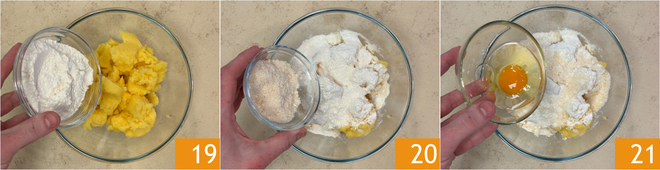 Während das Ragout köchelt, kümmert euch um die Gnocchi: Gebt die kalte und gut trockene Polenta in eine Schüssel, dann Mehl 19, geriebenen Käse 20 und das Ei 21 hinzu.