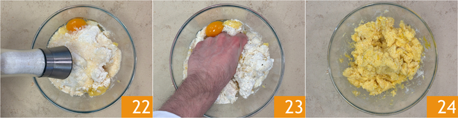 Salzen 22 und pfeffern. Alles mit den Händen vermengen 23, bis eine feste, homogene Masse entsteht 24.