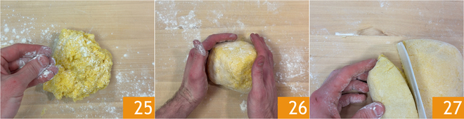 Den Teig auf die Arbeitsfläche geben, mit einer Prise Mehl bestäuben 25 und weiterkneten, bis ein glatter Laib entsteht 26. Den Laib in kleinere Portionen teilen 27.