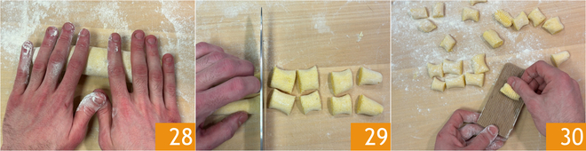 Rollt Stränge von etwa 1–2 cm Durchmesser 28, dann schneidet sie in Stücke von circa 2 cm 29. Zum Schluss die Stücke über das Gnocchi-Brett rollen oder mit den Zinken einer Gabel rillen 30.