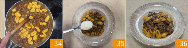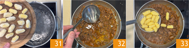 Nach der Garzeit des Ragouts prüfen, ob das Fleisch sehr zart ist. Bringt einen Topf mit gesalzenem Wasser zum Kochen und kocht die Gnocchi 31. In der Zwischenzeit das Ragout mit einer Kelle Kochwasser verlängern. Wenn die Gnocchi an die Oberfläche steigen, gießt sie direkt in das Ragout ab 33.
