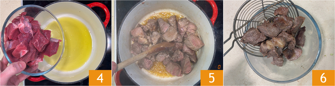 Erhitzt das Öl in einem großen Topf, gebt dann das in Würfel geschnittene Fleisch hinzu 4 und bratet es bei mittelhoher Hitze etwa 5 Minuten an, bis es goldbraun ist 5. Nehmt das Fleisch aus dem Topf und gebt es in eine Schüssel 6.