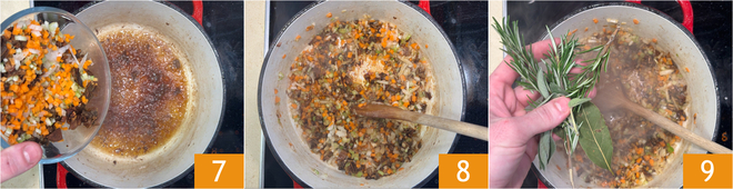 Gebt in denselben Topf die gehackten Gemüse, den Knoblauch und die getrockneten Pilze 7 und lasst alles ein paar Minuten anschwitzen 8. Wenn der Gemüseansatz weich geworden ist, würzt ihn mit Salbei, Rosmarin und Lorbeer 9.