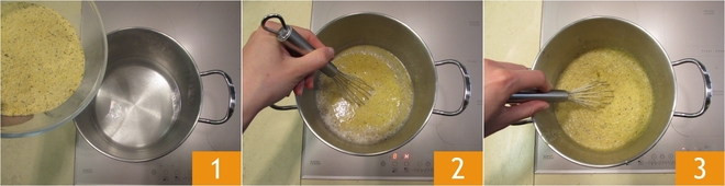 Um den Polenta-Sandwich mit Gemüse und Taleggio zuzubereiten, bereiten Sie zuerst die Polenta vor: Gießen Sie das Mehl in dünnem Strahl in kochendes, gesalzenes Wasser 1, dann kochen Sie es gemäß den Anweisungen auf der Verpackung (etwa 5 Minuten) und rühren Sie dabei ständig mit einem Schneebesen um 2, bis es eingedickt ist 3.