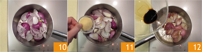 Fügen Sie die Zwiebeln hinzu 10 und lassen Sie sie unter häufigem Rühren ein paar Minuten weich werden. Fügen Sie den Zucker 11 und einen Spritzer Wasser hinzu und lassen Sie sie 4-5 Minuten karamellisieren, dabei gelegentlich umrühren. Löschen Sie mit Balsamico-Essig ab 12.