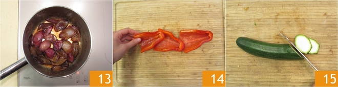 Wenn der Essiggeruch verschwunden ist, sind die Zwiebeln fertig 13. Schälen Sie das Gemüse und schneiden Sie die Paprika in große Stücke 14 und die Zucchini in schräge Scheiben von 5 mm 15.