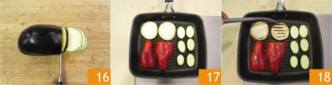 Schneiden Sie die Aubergine in 7 mm dicke Scheiben 16. Grillen Sie alles auf dem heißen Grill 17, bis Sie auf beiden Seiten schöne Grillstreifen erhalten 18.