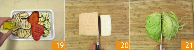 Würzen Sie das Gemüse mit Öl und Salz 19. Schneiden Sie den Taleggio DOP in 8-9 mm dicke Scheiben 20. Schneiden Sie den Salat in Streifen 21.